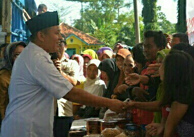 Bupati Lampung Tengah Mustafa yang hadir dan meresmikan pasar murah menyaksikan langsung antusiasme masyarakat yang datang dan membeli paket sembako yang disediakan pihak panitia.