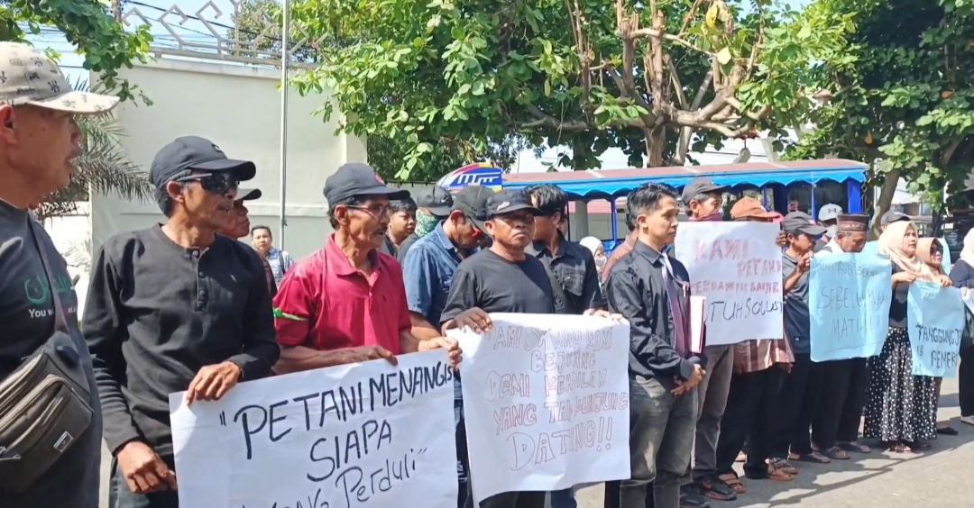 Massa meluapkan kekecewaan dengan berorasi serta membawa poster yang berisi tuntutan atas persoalan gagal panen yang mereka alami.