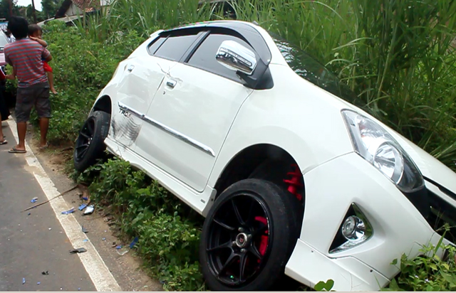 “Saya kaget ketika mobil truk menumbur bagian belakang motor saya, sehingga anak dan istri jatuh dan motor saya oleng ke kanan lantas dilindas mobil. Motor saya penyok dan ringsek. Saat itu juga terjadi tabarakan beruntun tiga mobil yang beda arah,” papar Hasanudin.